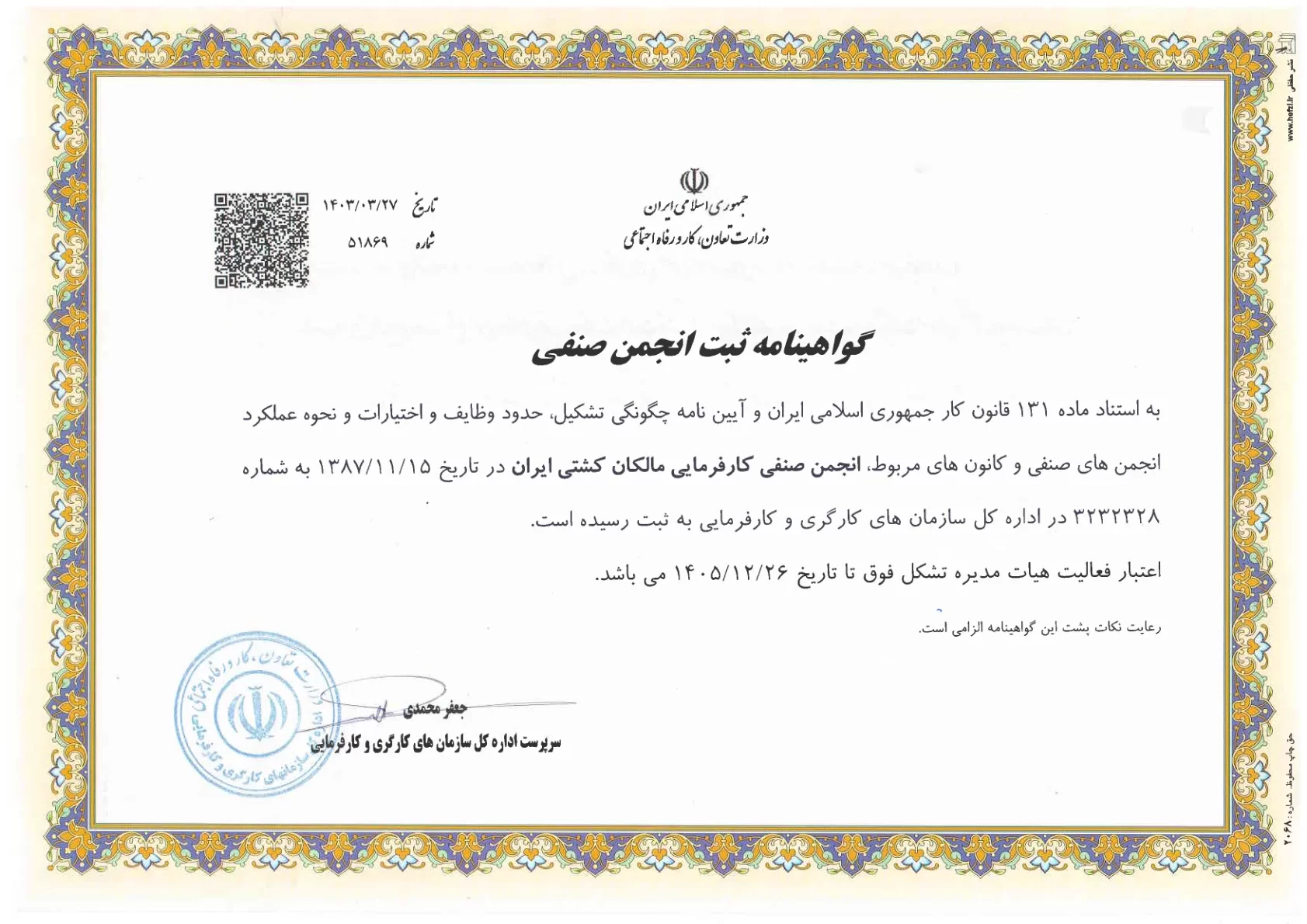 همچنین این اتحادیه به موجب ماده۱۳۱ قانون کار جمهوری اسلامی ایران و آئین نامه مصوب دی ماه ۱۳۷۱ هیأت وزیران در تاریخ ۱۵/۱۱/۸۷ به شماره ۳۲۸/۲/۳-۳۲ در اداره کل سازمان های کارگری و کارفرمایی وزارت کار و امور اجتماعی به ثبت رسیده است .