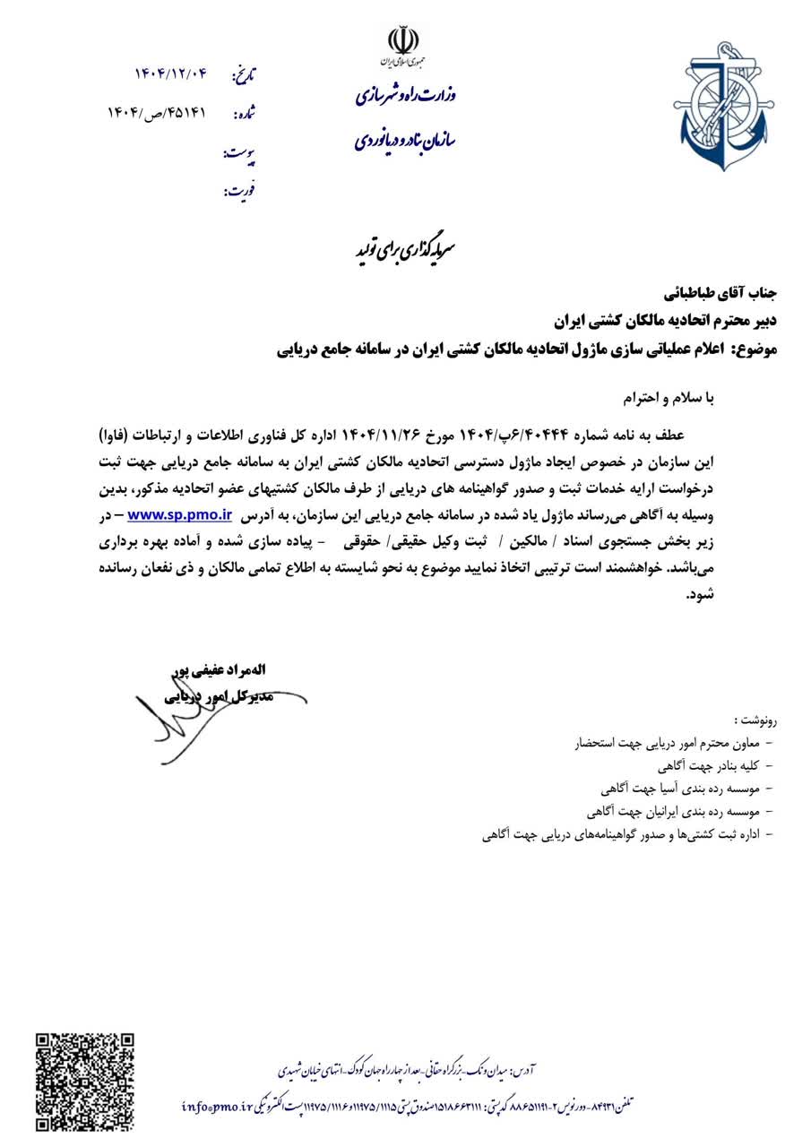 این اقدام در راستای تسهیل امور اداری، کاهش مراجعات حضوری و تسریع در فرآیندهای ثبتی شناورها صورت پذیرفته است.